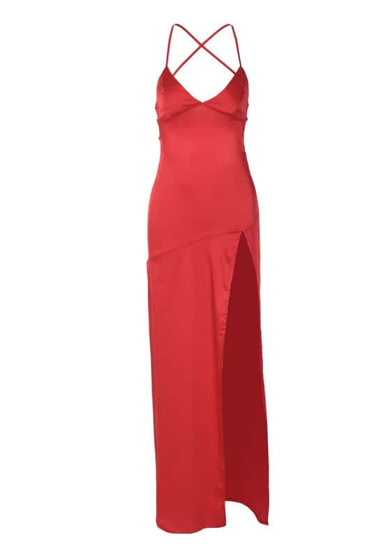 Simply Red Pleated Satin Long Bridesmaid Dress