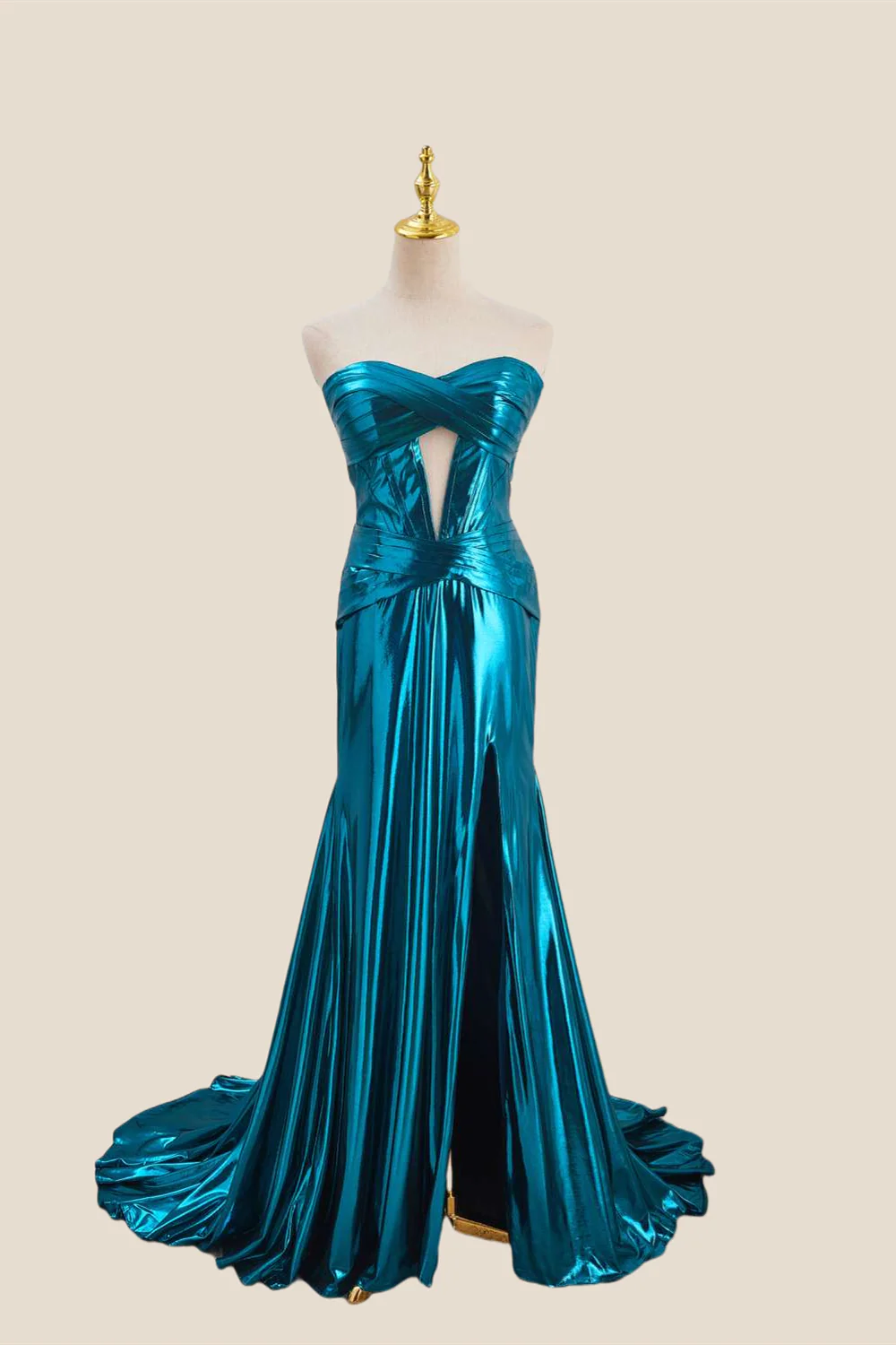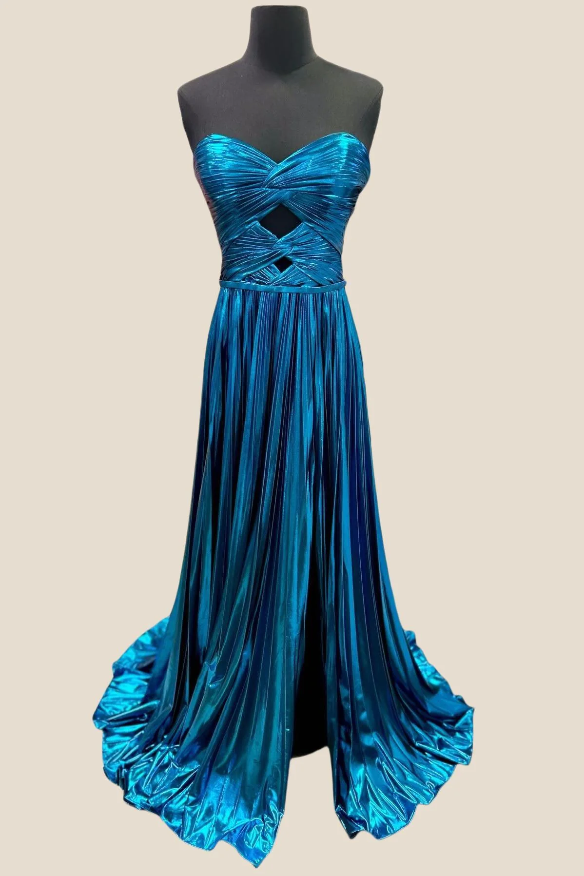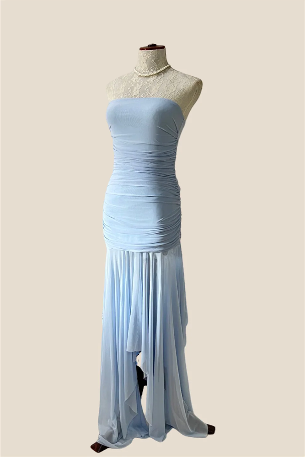 Strapless Blue Pleated Tiered Short Dress with Rosette