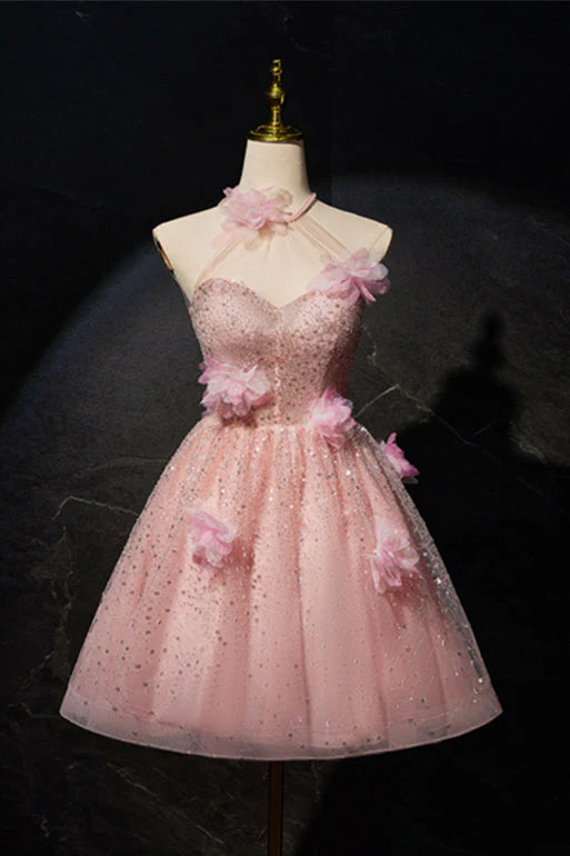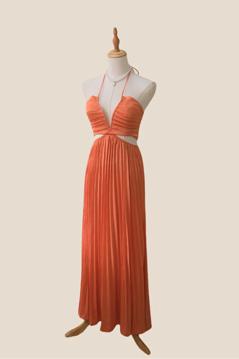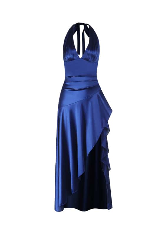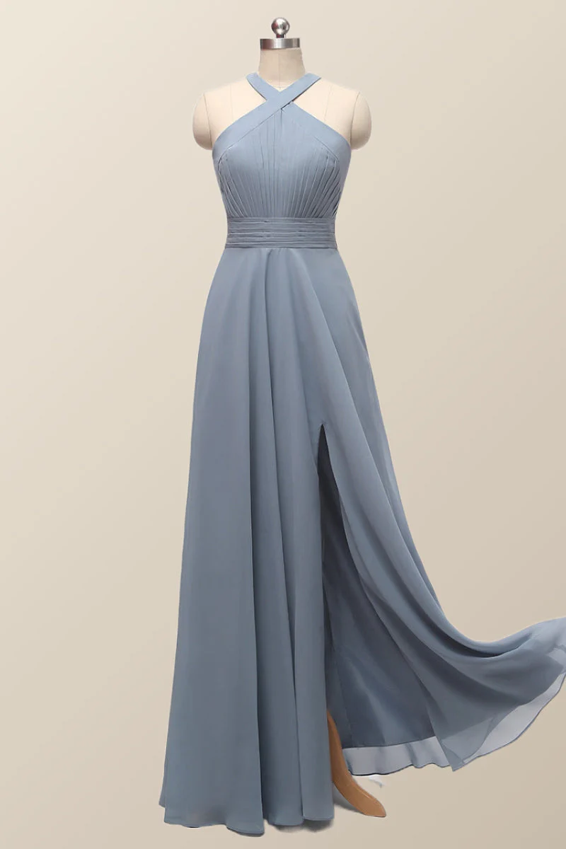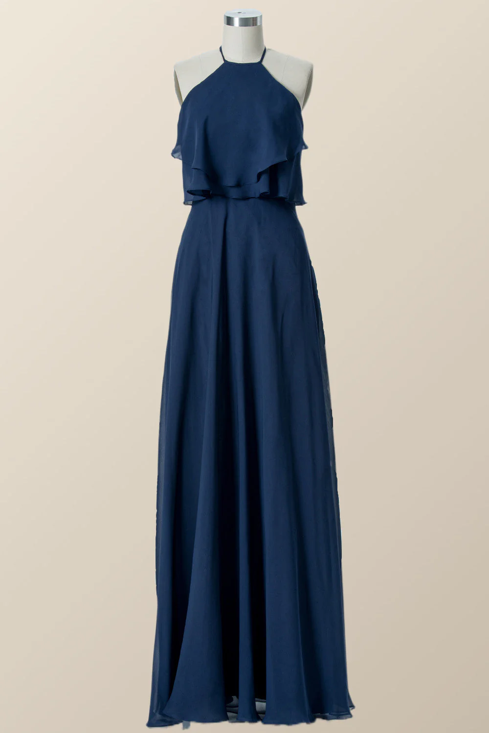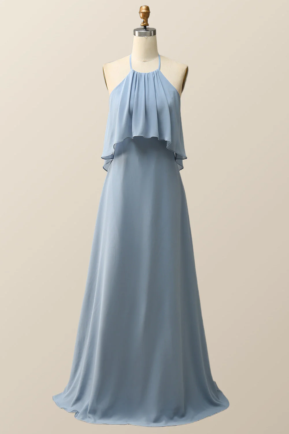Halter Misty Blue Ruffle Chiffon Long Bridesmaid Dress