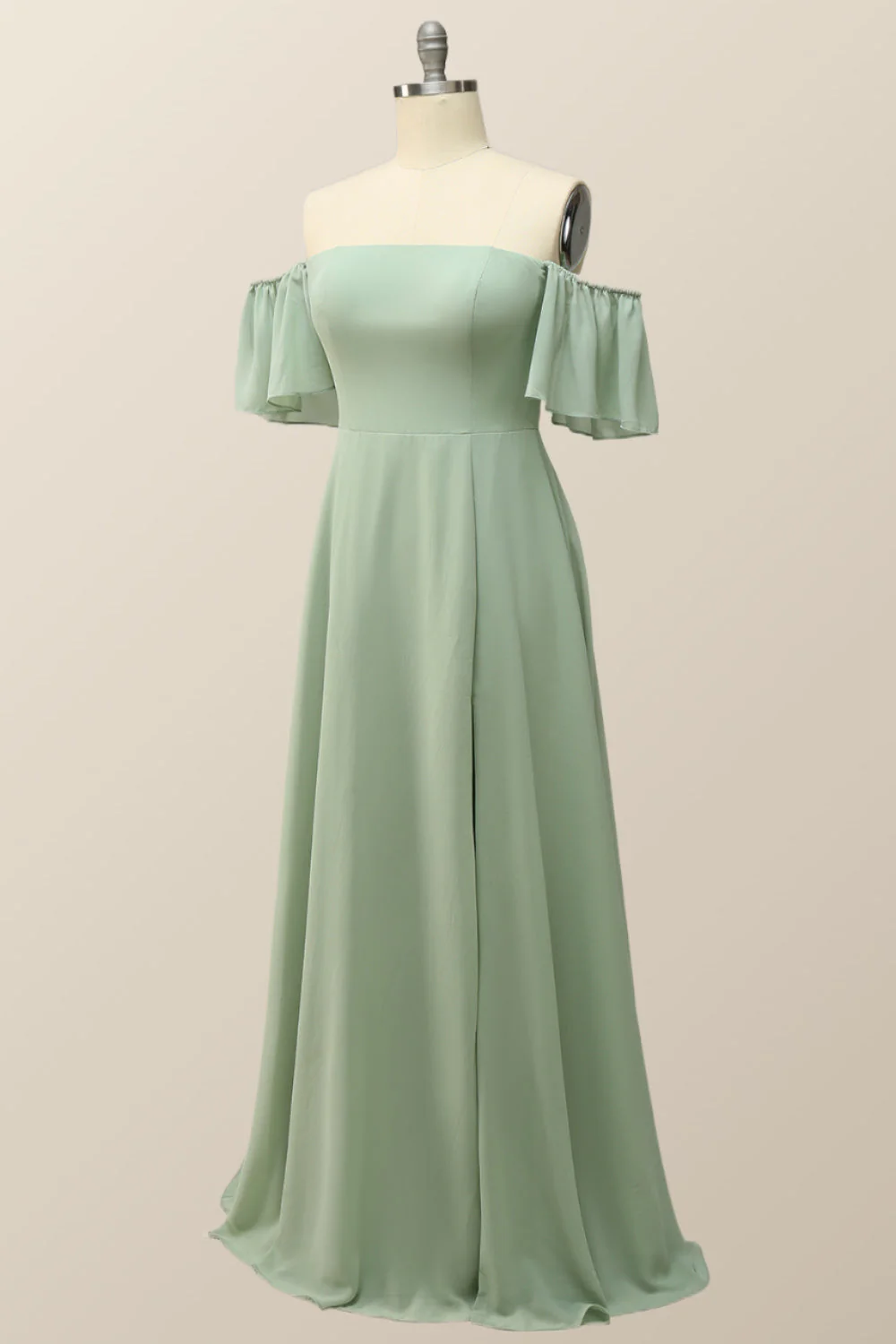 Off the Shoulder Sage Green Chiffon Long Bridesmaid Dress