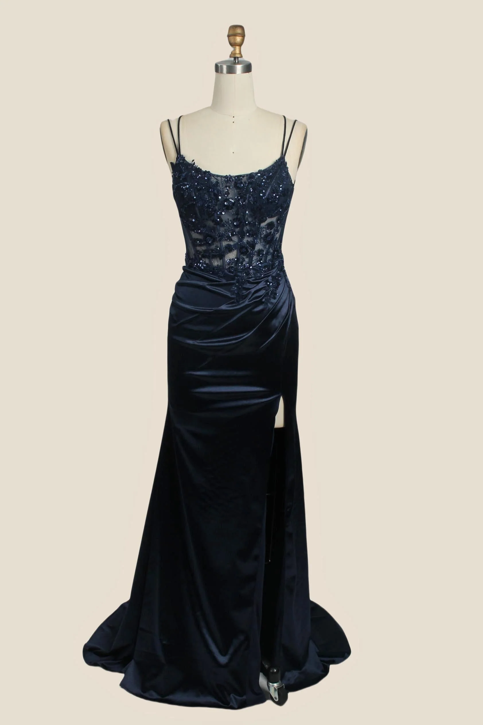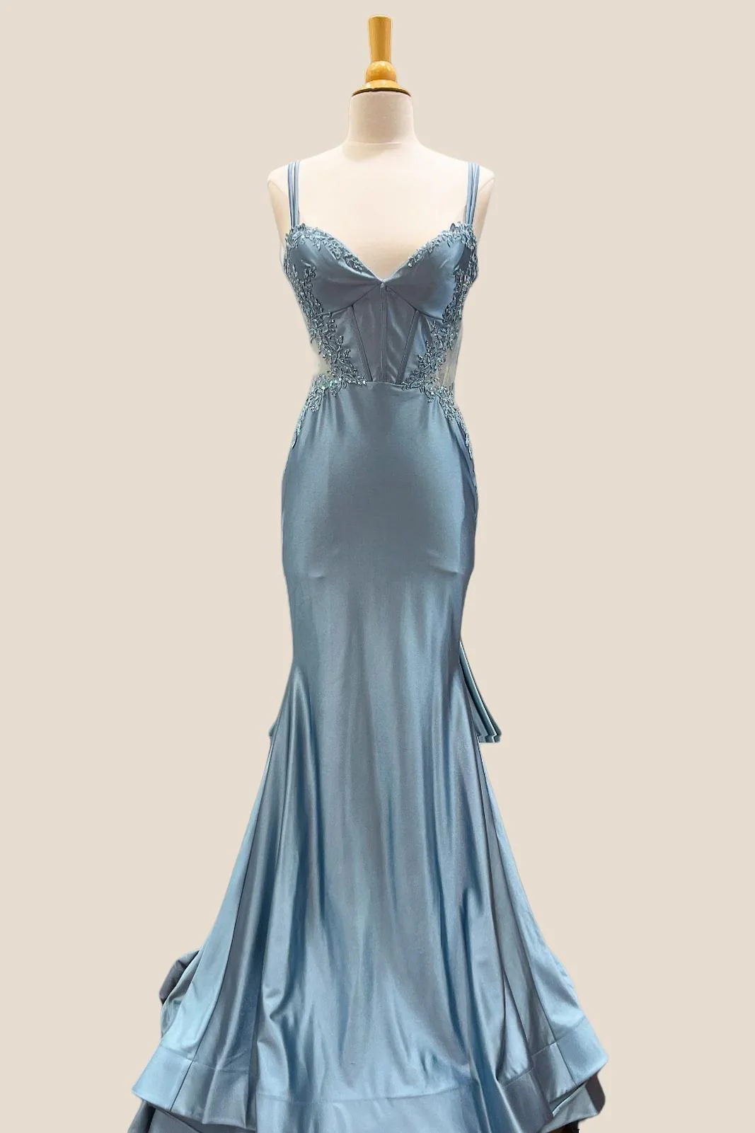 Double Straps Dusty Blue Appliques Long Dress