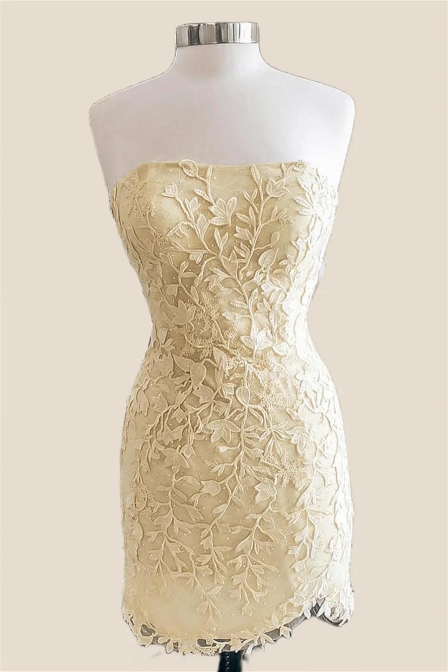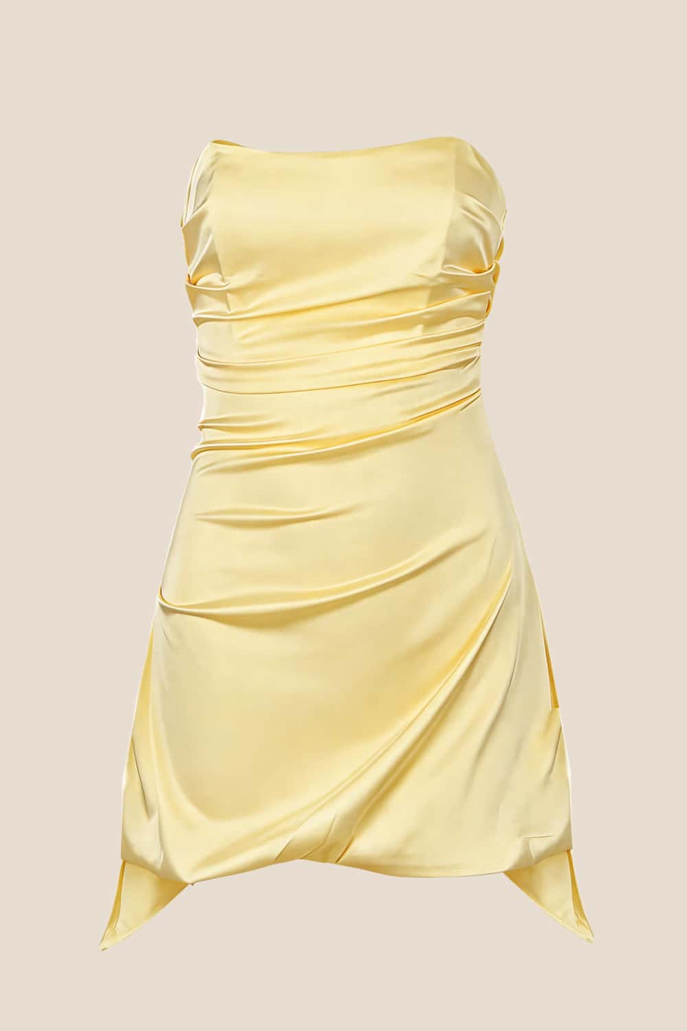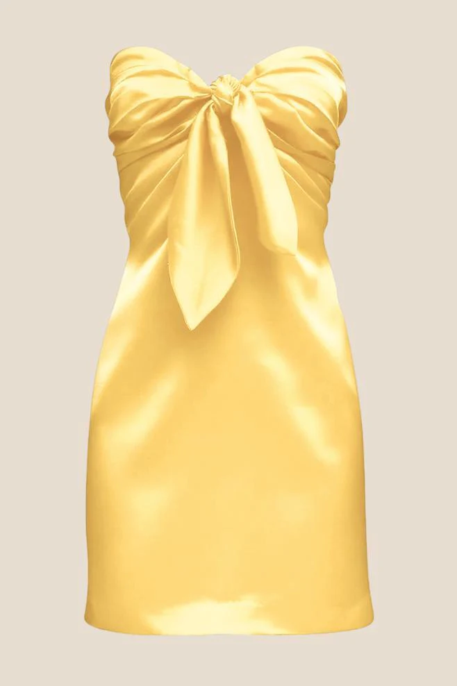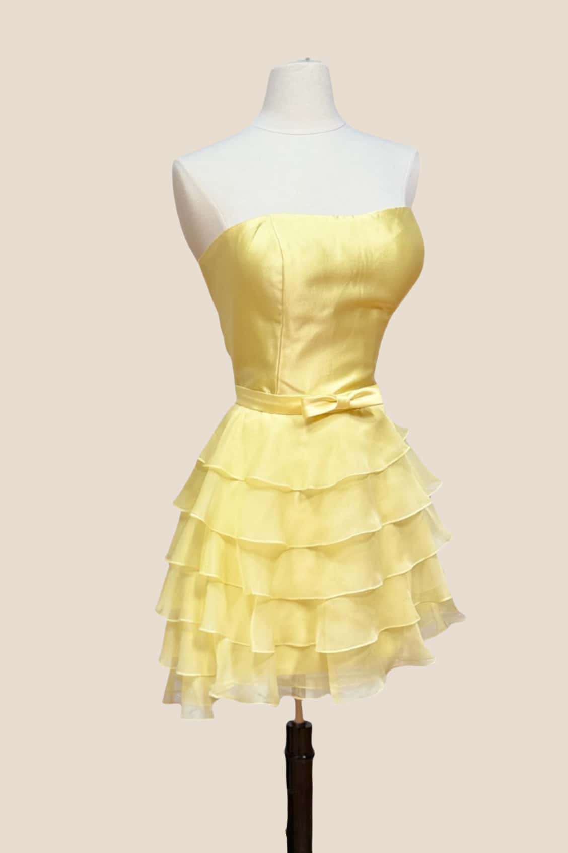 Strapless Yellow Pleated Tiered Short Dress with Rosette