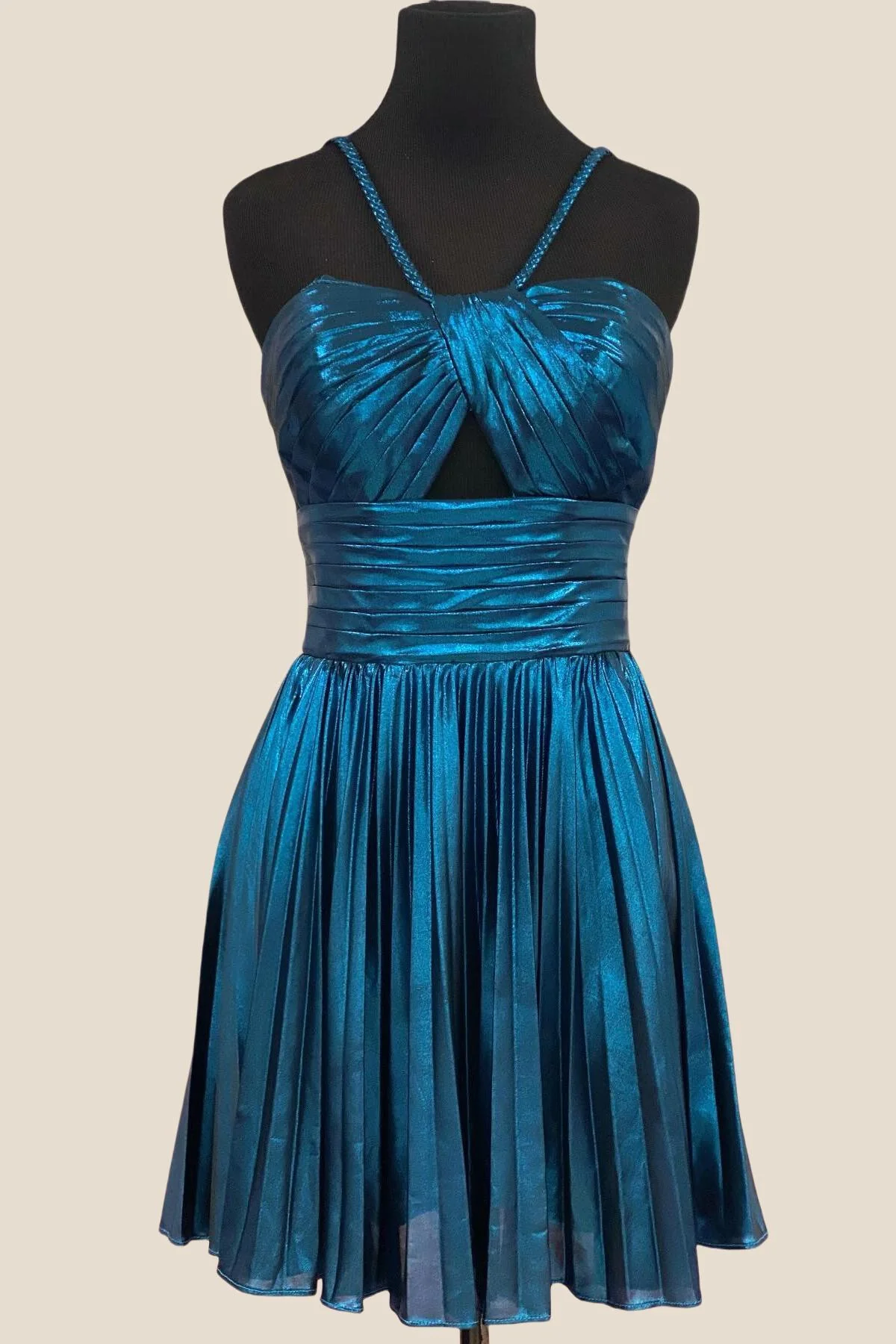 Peacock Metallic Halter Pleated A-line Short Dress